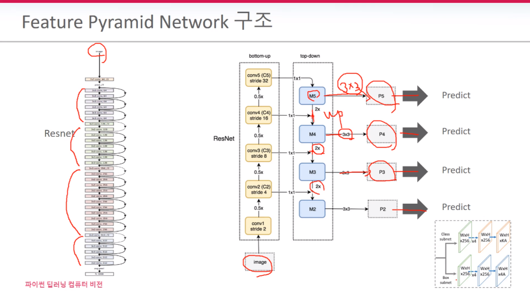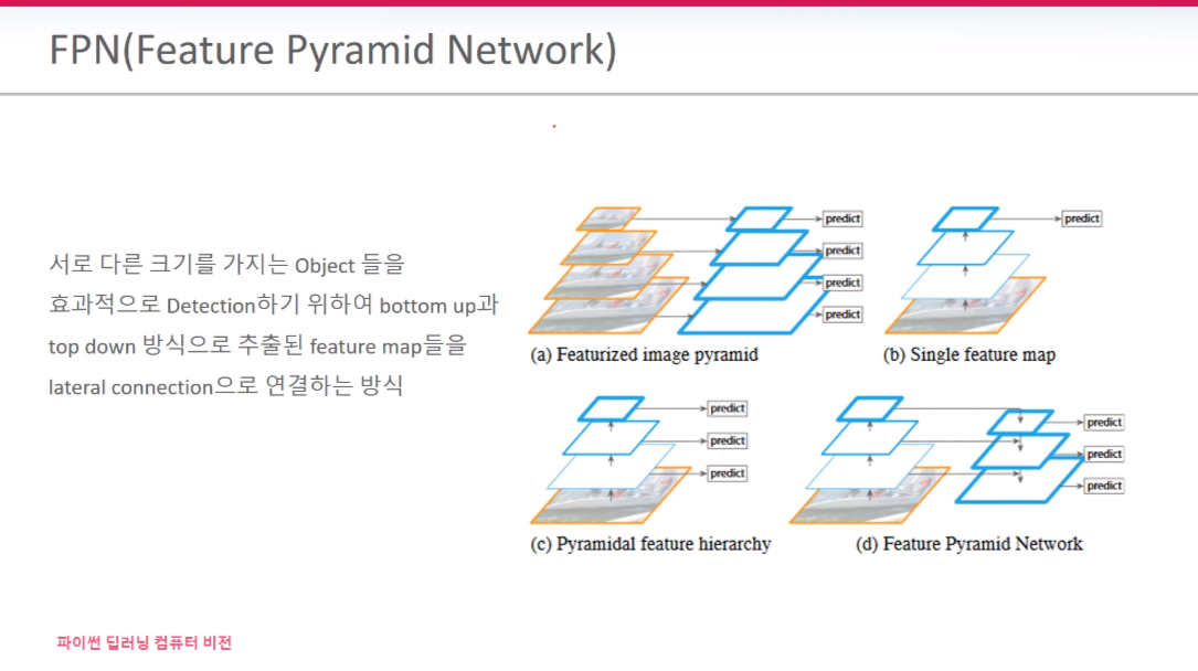 c) 그래서 c처럼 각 레벨에 있는 FM을 detect하는 방법을 취한다. 대표적으로 SSD가 그 예로 들수 있겠다. 하지만 FM이 상위로 갈수록 손실되는 정보는 있기 때문에 이를 보완하기 위해