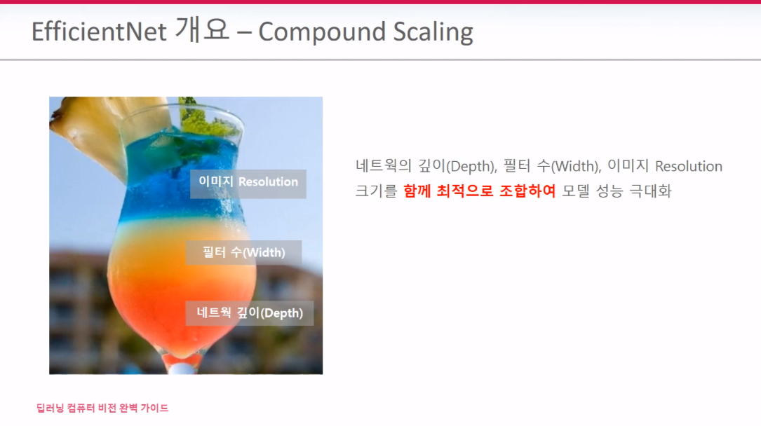 이미지 해상도, 필터수, 네트웍 깊이 와같은 구성요소를 따로 따로 최적화 하기 보다는 모두 조화롭게 최적화하는 방법을 적용하여 모델의 성능을 극대화한 것이 EfficientNet이다