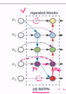 BiFPN은 PANet에서 조금 개량된 버전이다. PANet과 큰 차이점은 repeated block, 즉 반복으로 사용할수 있다는 점이다. PANet은 위 그림 과정이 전부이다. 하지만 BiFPN은 위와 같은 BiFPN 블락을 몇개씩 사용가능 하다는 것이다. BiFPN 블락을 몇개 사용할건지 정하는 것은 Compound Scaling을 통해 정한다.