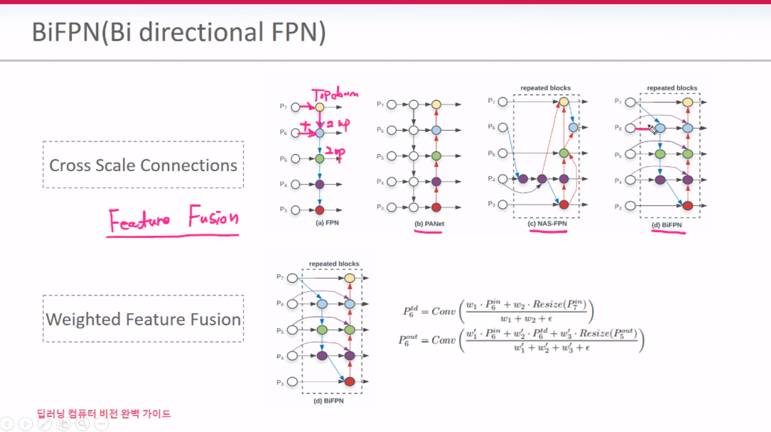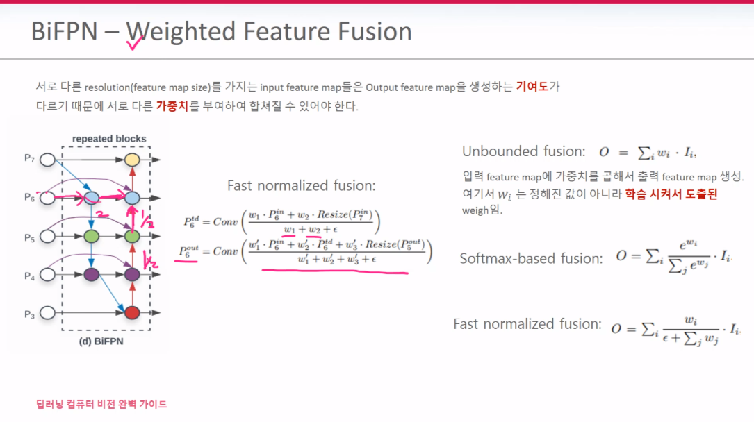 각 화살표마다 학습된 가중치를 활용하는 기법이다. 값이 갑자기 커지는 것을 방지하고자 사용된 가중치를 가지고 Fast Normalized fusion을 적용한다.