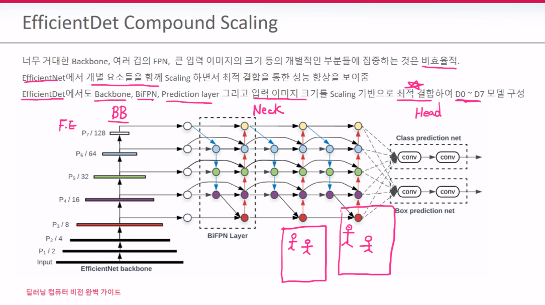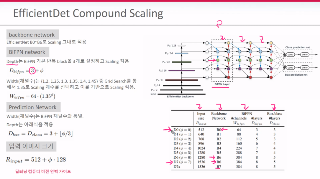 compound scaling을 통해 각 모델별로 최적의 값을 찾아 낼수 있다. 이 개념을 EfficientDet에도 똑같이 적용시킬수 있다. BB, Neck,head 에서 최적의 값을 CS를 통해 찾을수 있다.