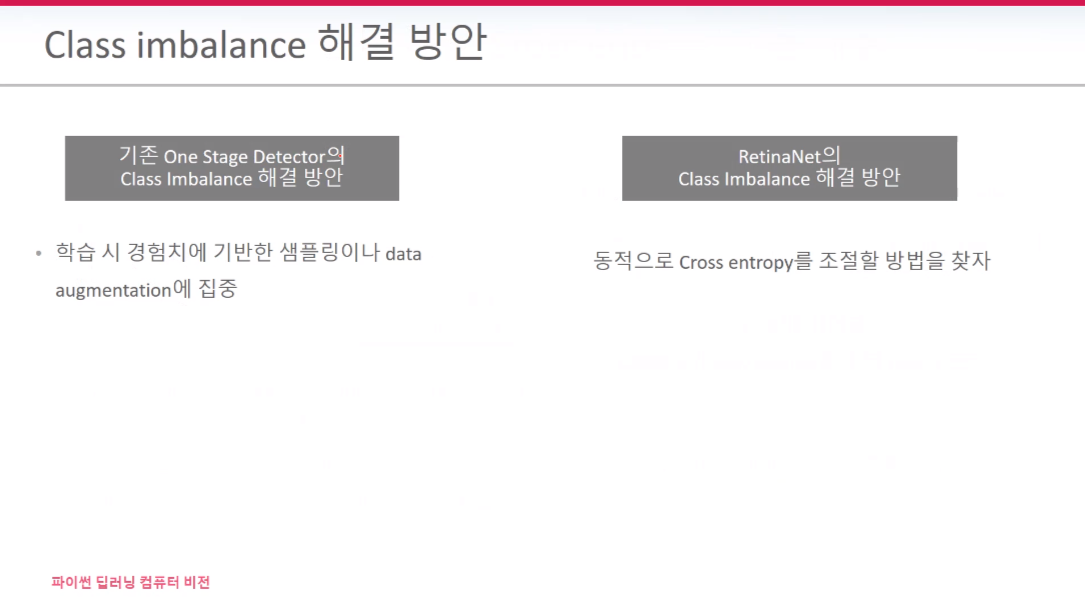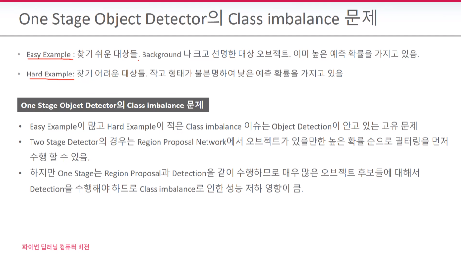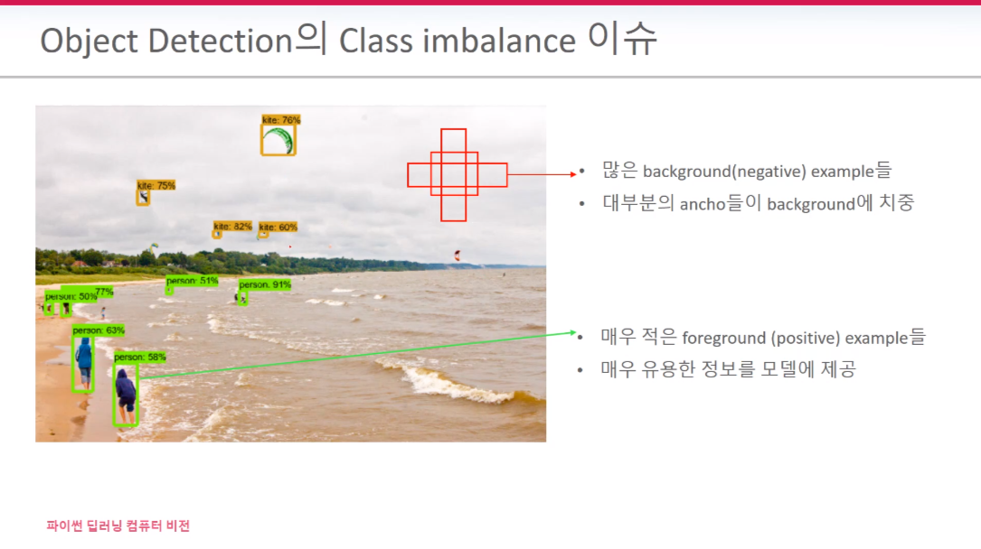 검출해야할 객체보다 백그라운드가 많아서 대부분 앵커박스들이 백그라운드에 학습값으로 치중이 된다. 반면 적은 수의 foreground에서 정보를 가져와야하는데 백그라운드 정보 때문에 압도가 된다. 따라서 Object Detection은 본질적으로 이런 문제를 안고 있다.