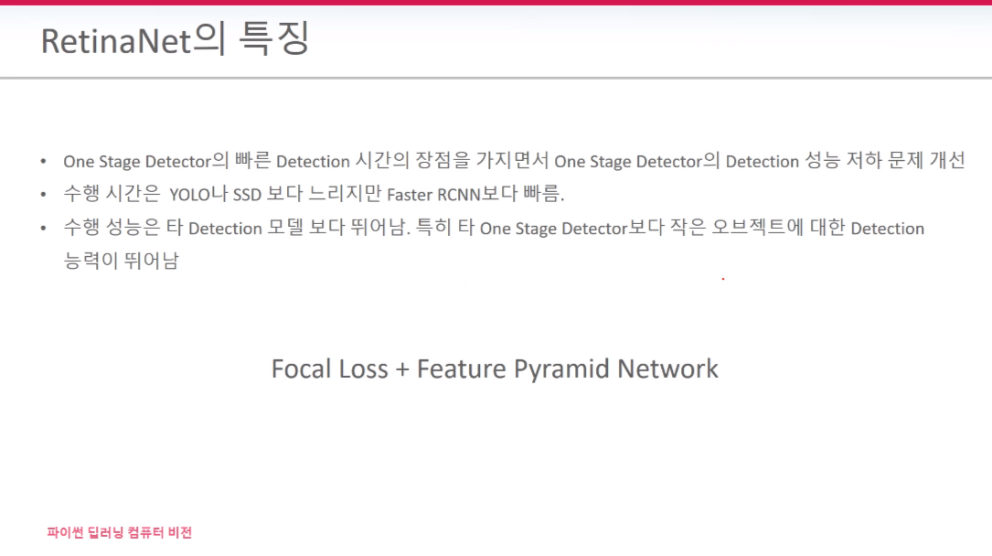 RetinaNet이 나오기 전까지는 one-stage 는 수행 시간이 짧아서 좋지만 수행능려은 faster RCNN보다 떨어진다는 인식이 있었다. one-stage의 고질병이던 작은 객체검출 문제를 개선시킴