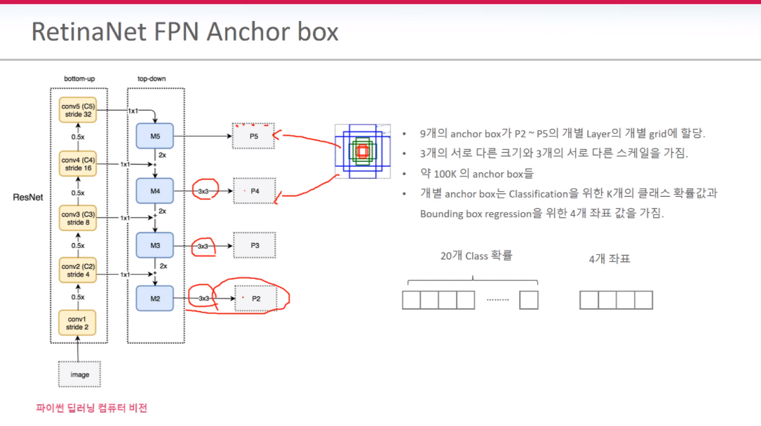 3*3을 거친 P5~P2 layter 에서 앵커박스르 적용한다. 9개의 앵커가 개별 포인트에 모두 찍히게 된다. P2로 갈수록 FM크기가 커지므로 당연히 앵커 박스의 수도 증가한다. 총 앵커박스를 합치면 약 십만개이다. 십만개 앵커박스로 분류와 예측 학습을 실행한다.