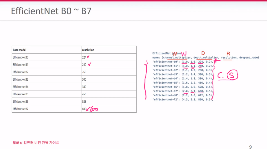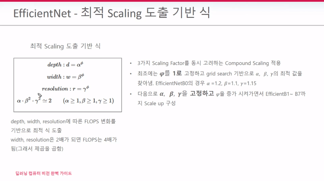 제일 좋은 차를 만들기 위한 구성 요소 세가지 마력, wheel, 타이어가 있다고 가정한다. 단순하게 가장 좋은 차를 만들려면 비싸고 좋은 성능을 보이는 구성요소만 뽑아서 조합하면 된다. 하지만 현실은 그와 반대일 가능성도 있다는 것이다. 가장 좋은 것들을 모아놓아도 서로 조화롭게 어우러 지지않으면 수행능력은 기대치를 밑돌게 된다. 마치 눈, 코, 입 따로 봤을땐 원빈인데 얼굴 전체를 보면 갸우뚱하는 경우를 예로 들수 있다. 그러면 마력 , wheel, 타이어를 어느정도 비율 or 크기로 가져가면 최적화가 될수 있는가를 계산하는 것이 Compound Scaling이다.