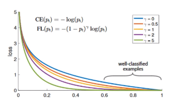위 그림이 Focal loss의 factor 가중치이다. Focal Loss에 분류하기 쉬운 문제(Easy Negative Examples : Backgrounds)보다 분류하기 어려운 문제(Hard Positive Examples : object(foreground))에 더 많은 가중치(factor 감마)를 적용함으로써 Object 검출에 더욱 집중하여 학습 진행한다. 따라서 잘 검출된 객체와 그렇지 못한 객체 사이의 loss값의 차이를 더욱 분명하게 구별할수있다.