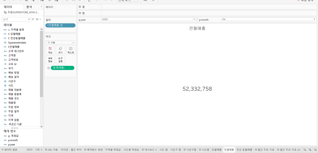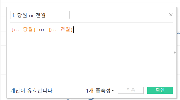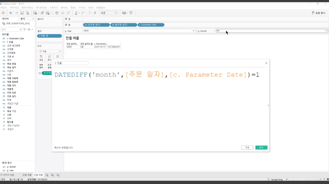 주문일자의 month와 c.parameter의 차이가 1이라는 뜻이다. 필터를 f.전월을 넣어서 정리하면 아래와 같다.