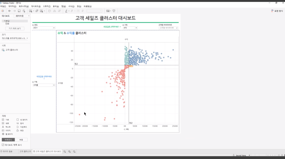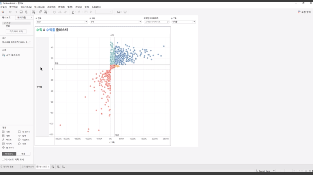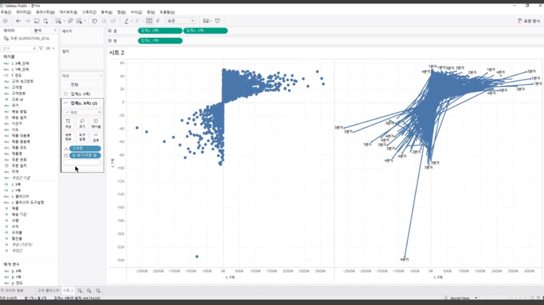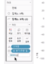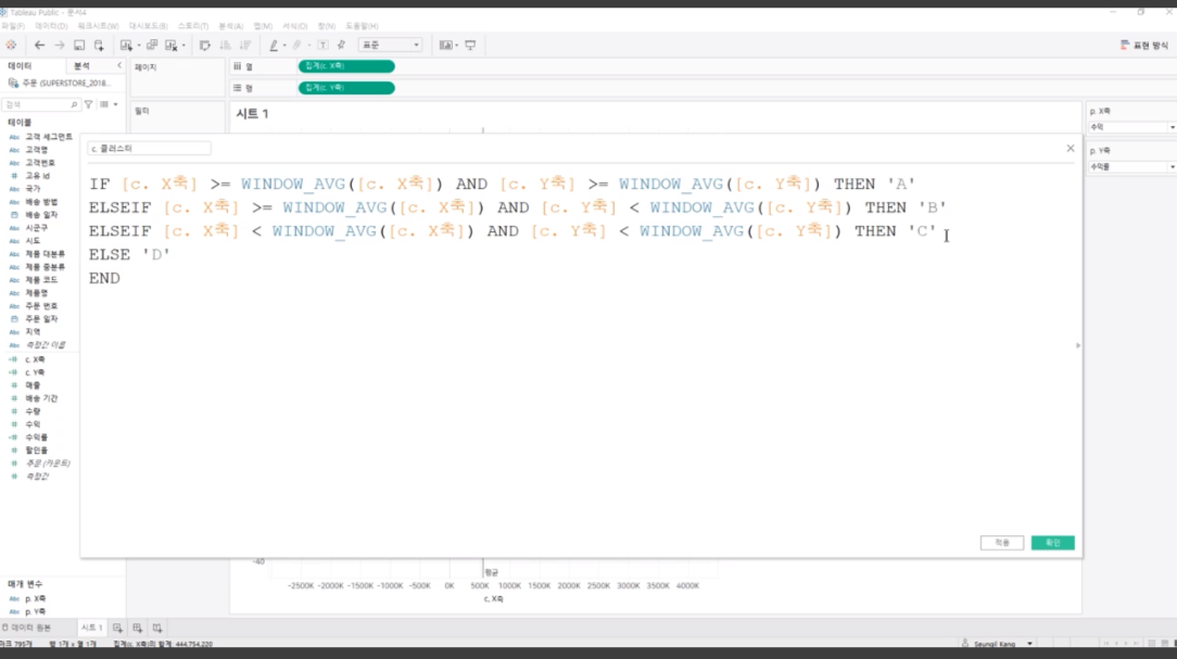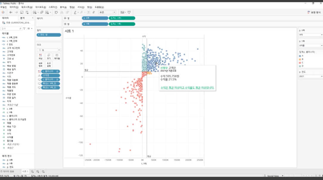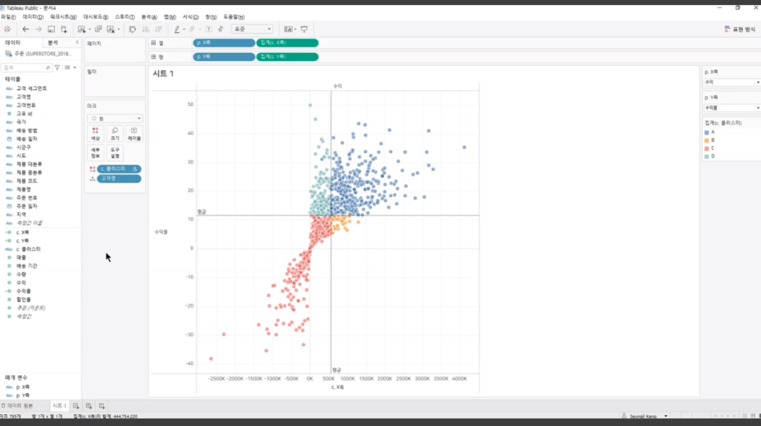 사분면을 기준을 위 와같이 정해준 뒤 색상 마크에 넣어준다. 다음을 사용하여 계산 -> 고객명 순서대로 클릭하여 각 고객에 따라 색상을 달리 구분한다.
