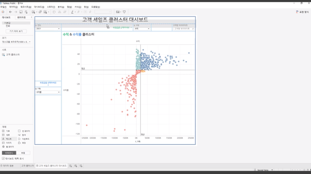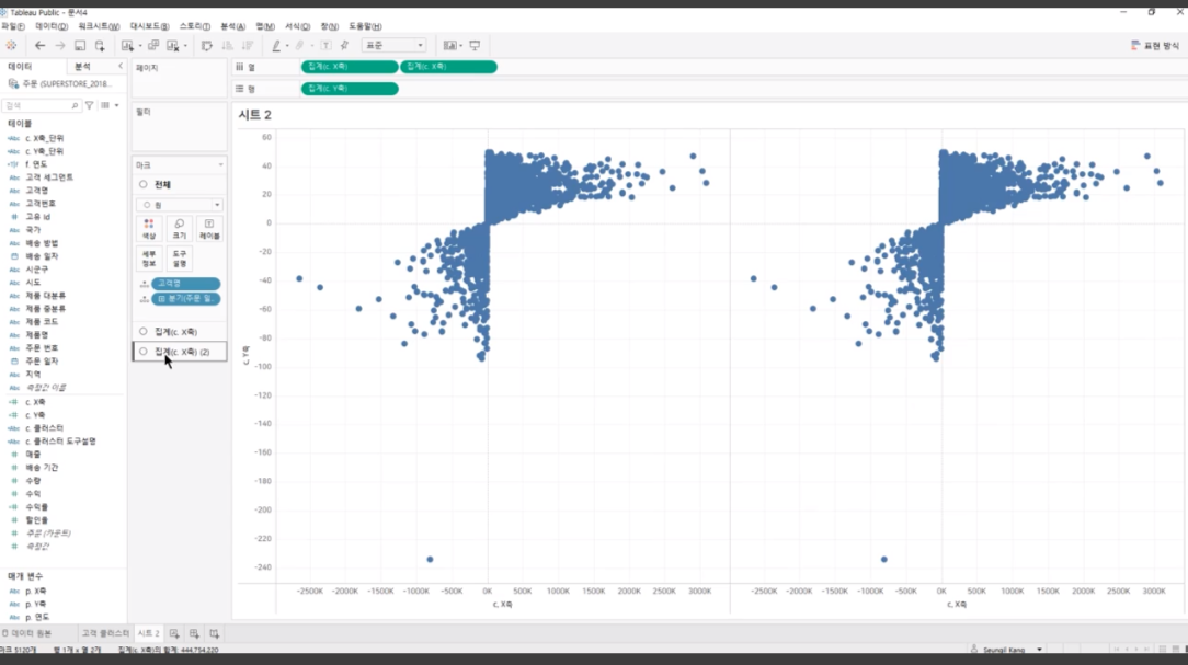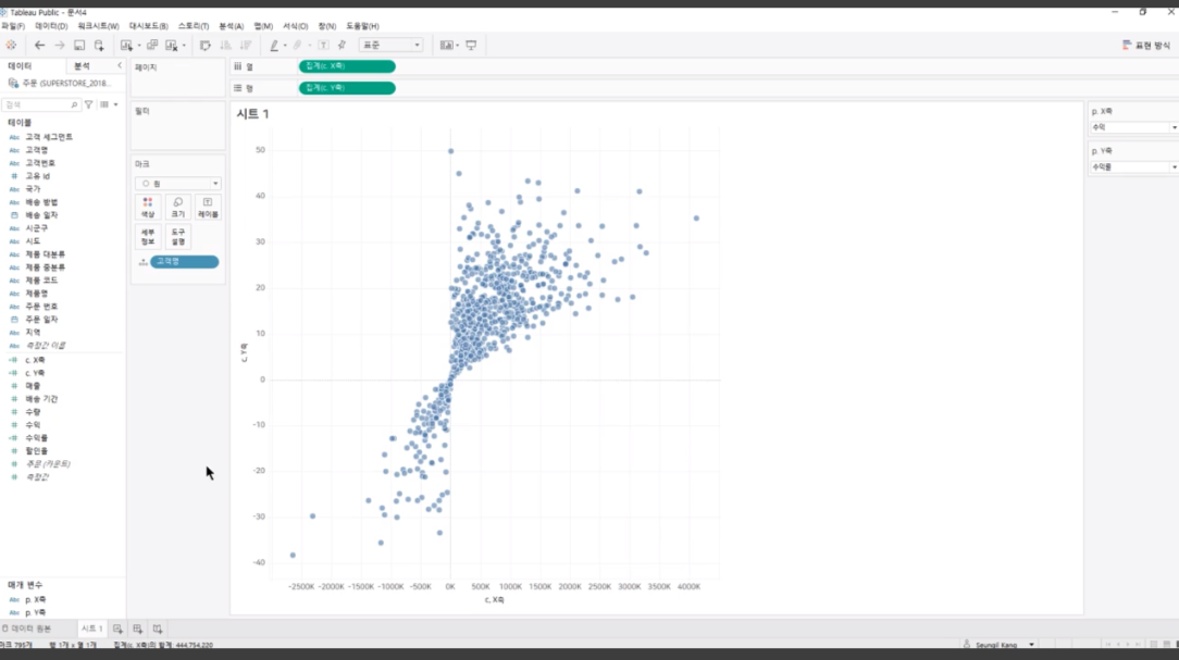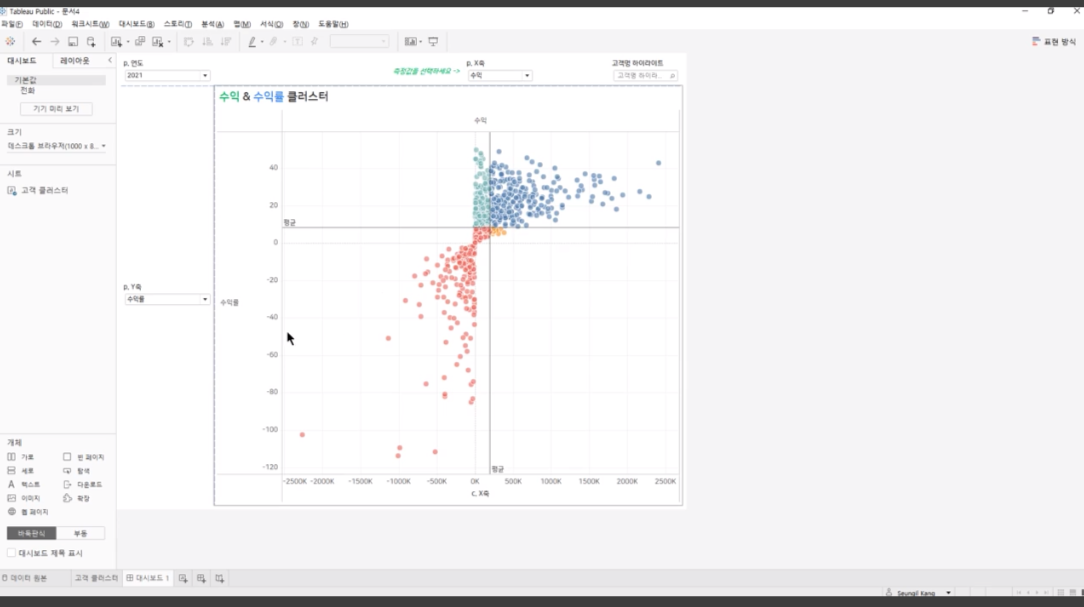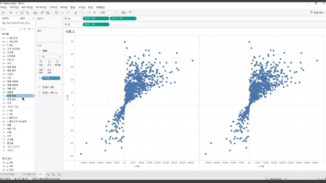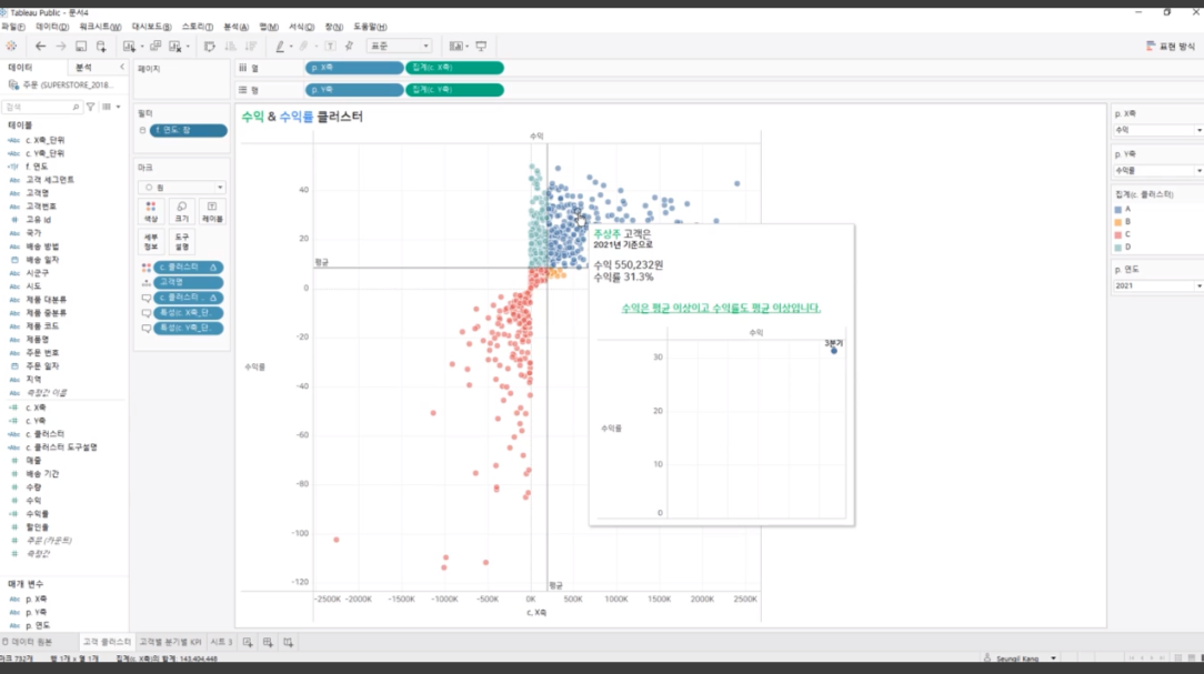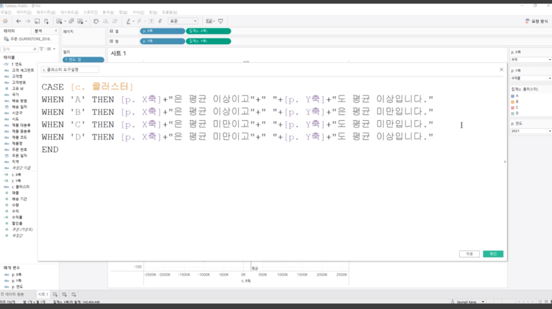 사분면을 기준을 위 와같이 정해준 뒤 색상 마크에 넣어준다. 다음을 사용하여 계산 -> 고객명 순서대로 클릭하여 각 고객에 따라 색상을 달리 구분한다.