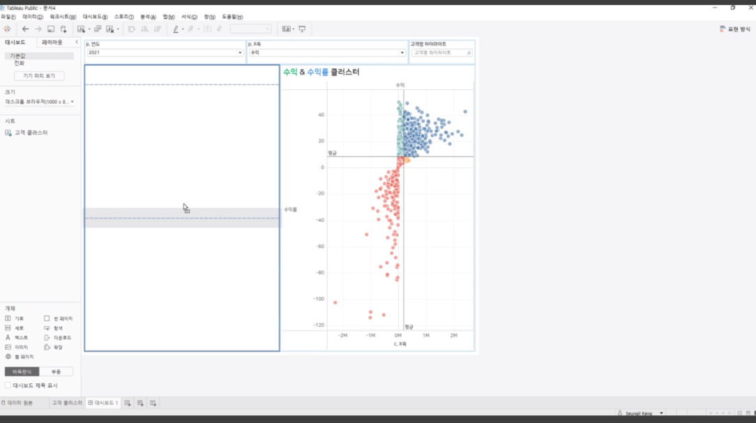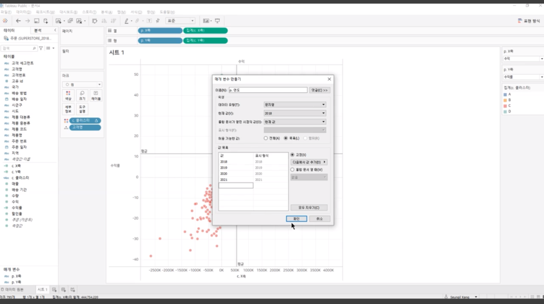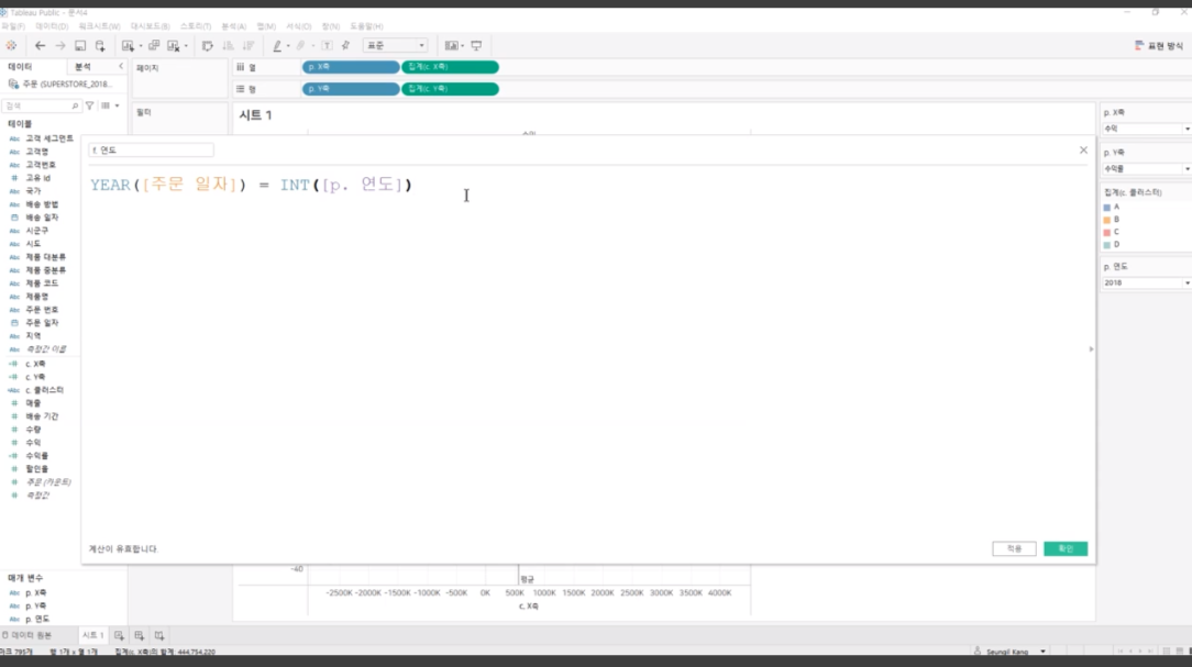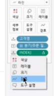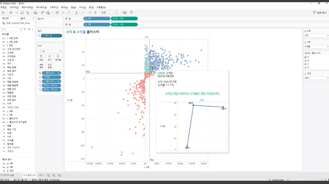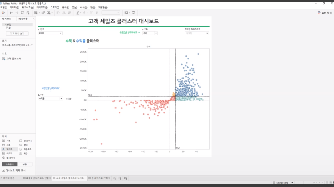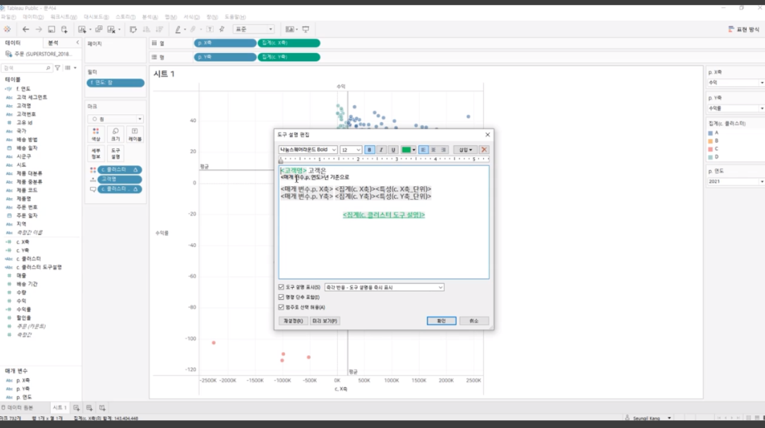 사분면을 기준을 위 와같이 정해준 뒤 색상 마크에 넣어준다. 다음을 사용하여 계산 -> 고객명 순서대로 클릭하여 각 고객에 따라 색상을 달리 구분한다.