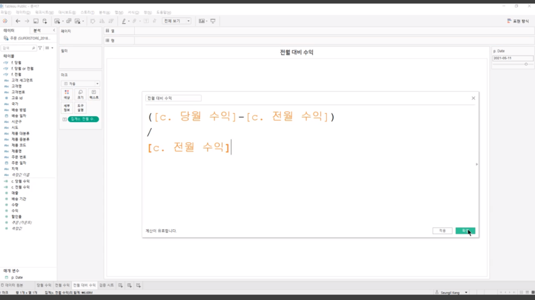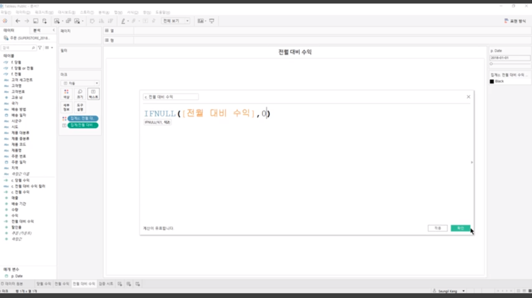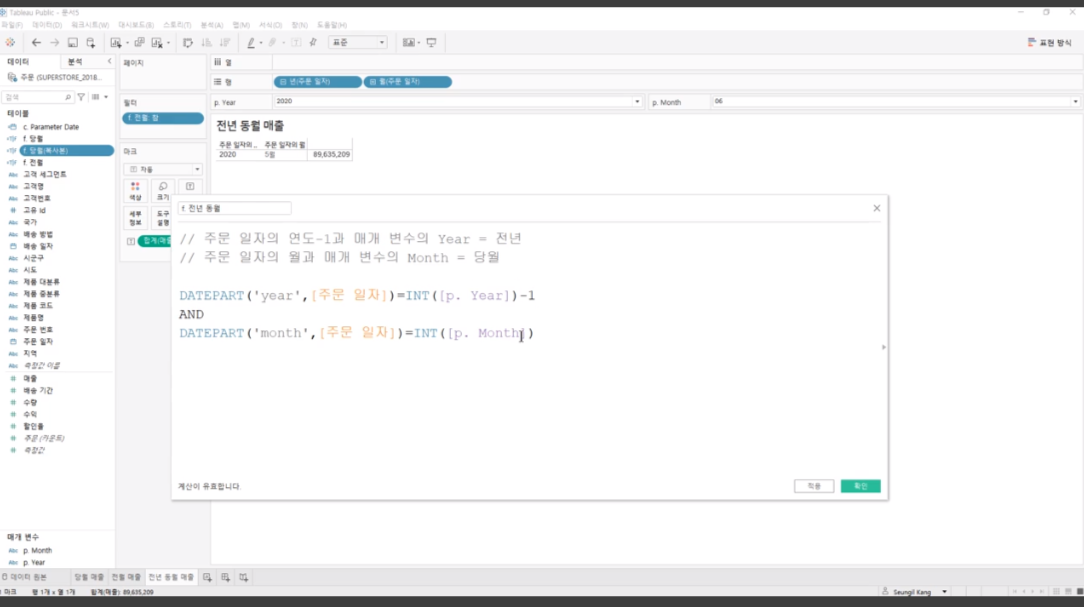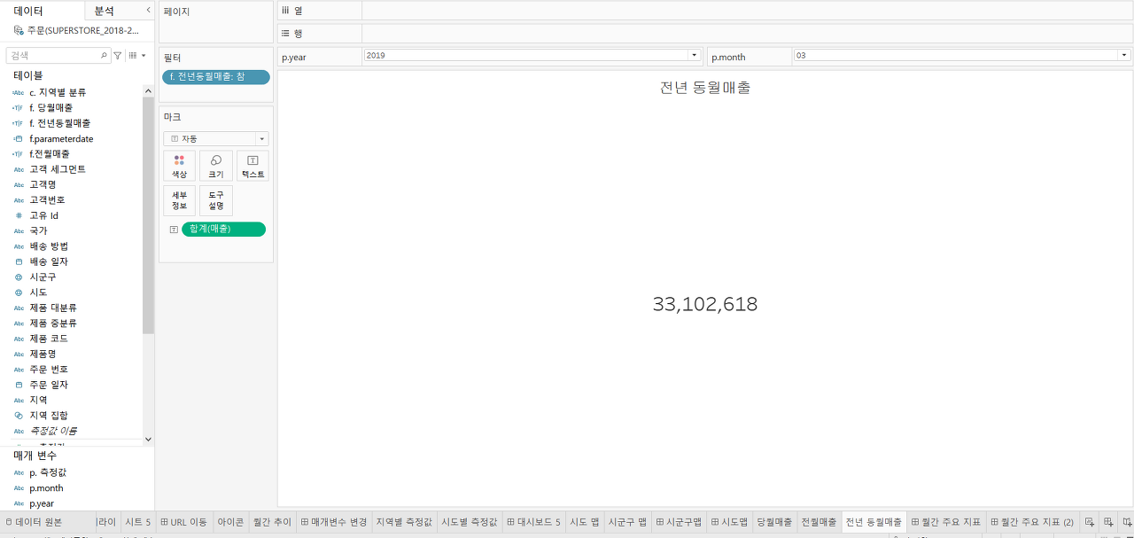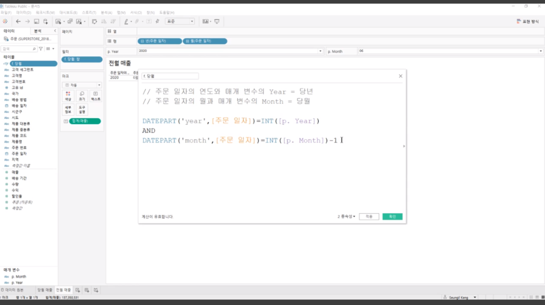 동월 매출의 계산식 필드에서 year 부분에서 -1을 해주면 전년 동월 매출을 알수있다.