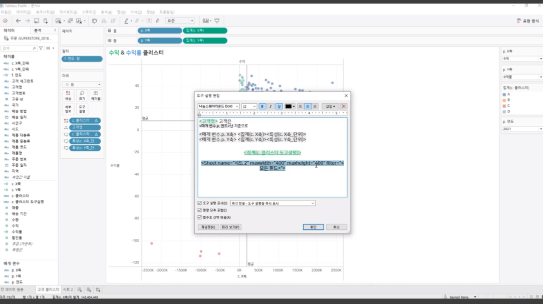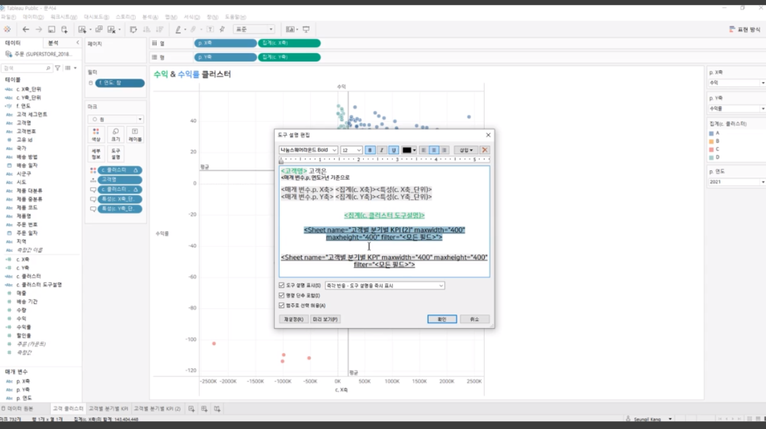 마찬가지로 고객 클러스터의 도구 설명에 가서 방금 만든 워크시트를 삽입한다.