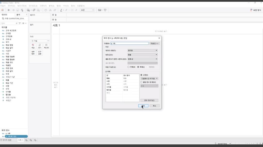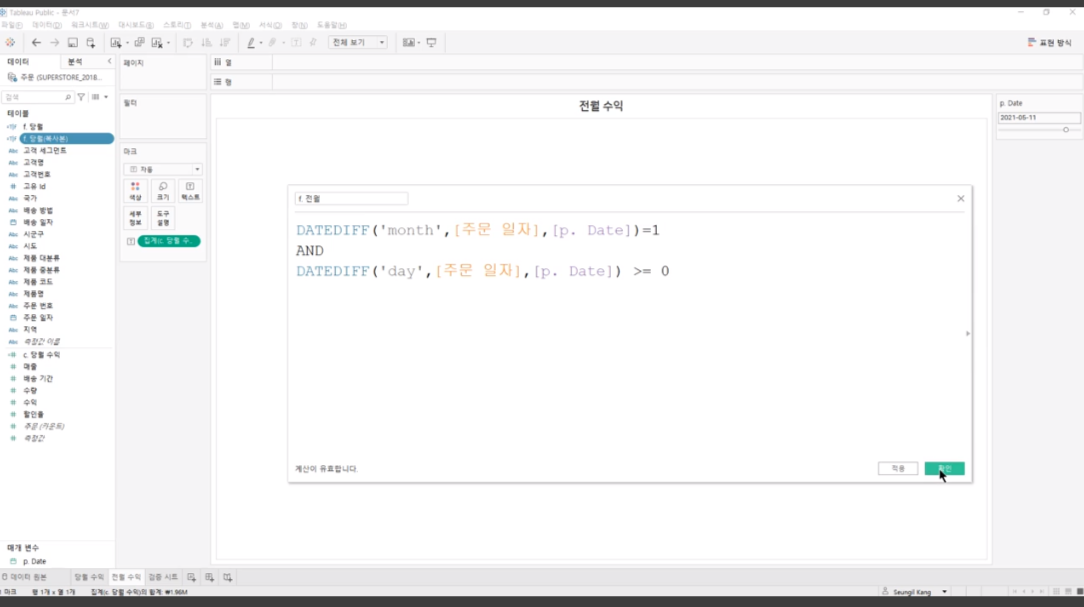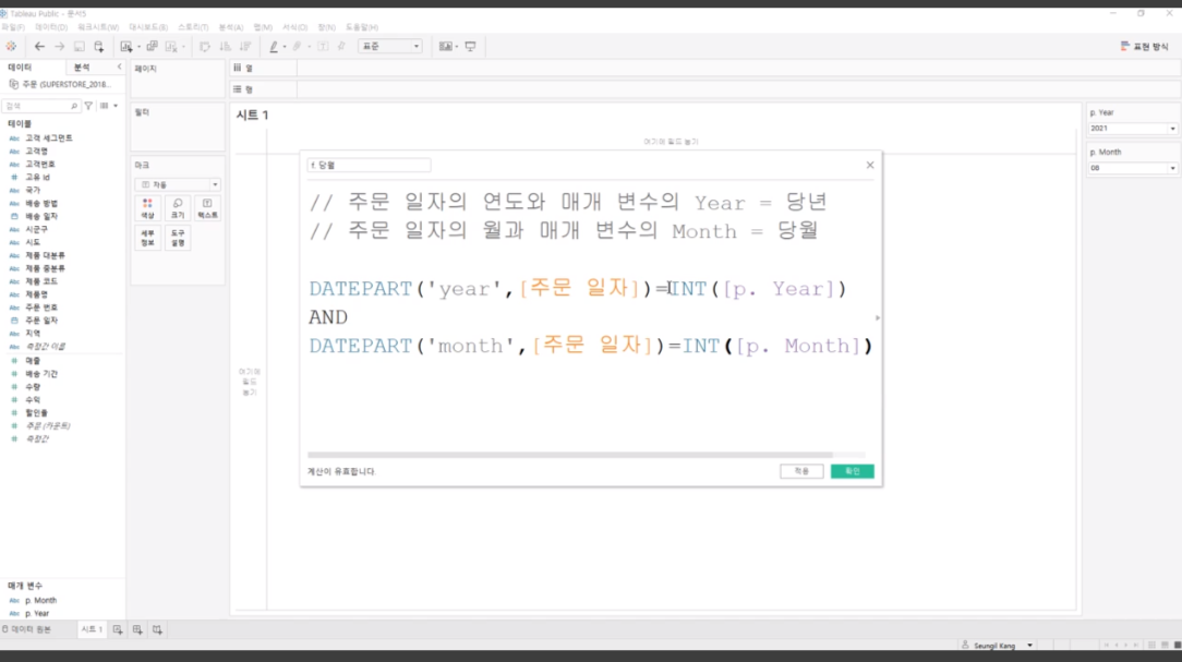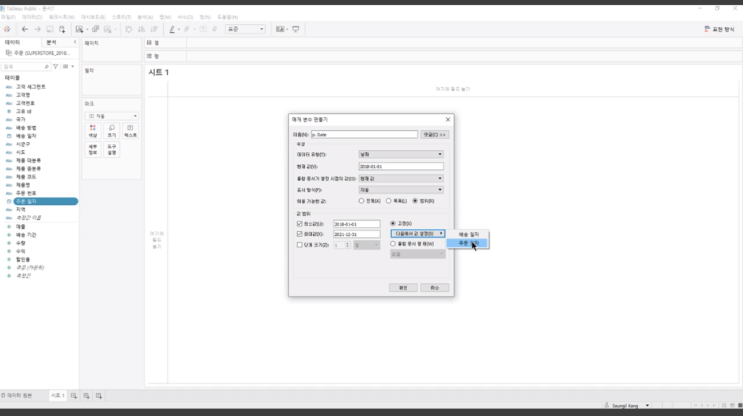범위에서 주문일자를 선택하면 데이터 원본에 있는 날짜를 모두 반영할수 있다. 만들어진 매개변수 날짜를 기준으로 값을 만들어본다.