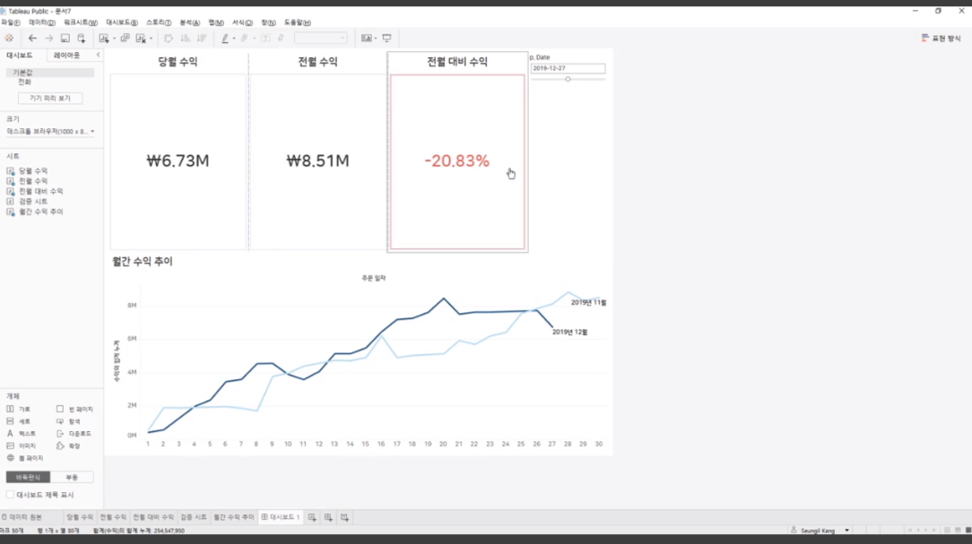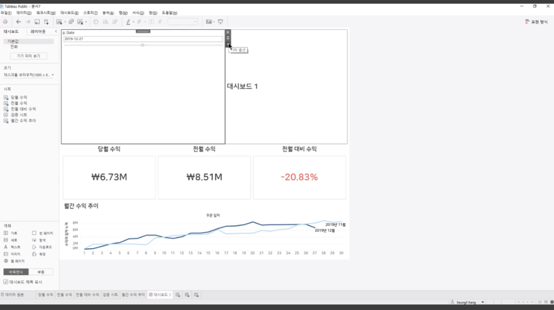 대시보드1 밑에 가로 개체를 하나 넣은 후에 p.year 와 p.month를 넣어서 정리하여 마무리한다.