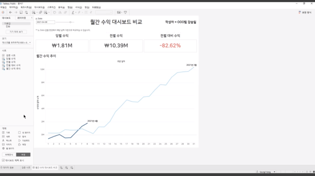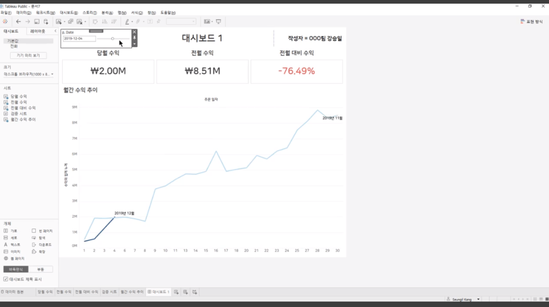 매개변수는 아래 세모 옵션의 너비 편집을 사용하여 줄일수 있다. (245로 변경) 개체의 텍스트를 대시보드 제목 옆에 넣어서 작성자를 입력한다.