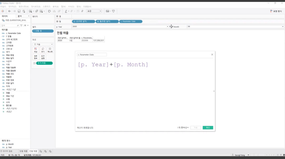 당월의 계산된 필드내용을 재활용 할수 없다. 2021년 0월은 없기때문이다. 먼저 p.year & p.month를 조합한 매개변수를 생성한다.