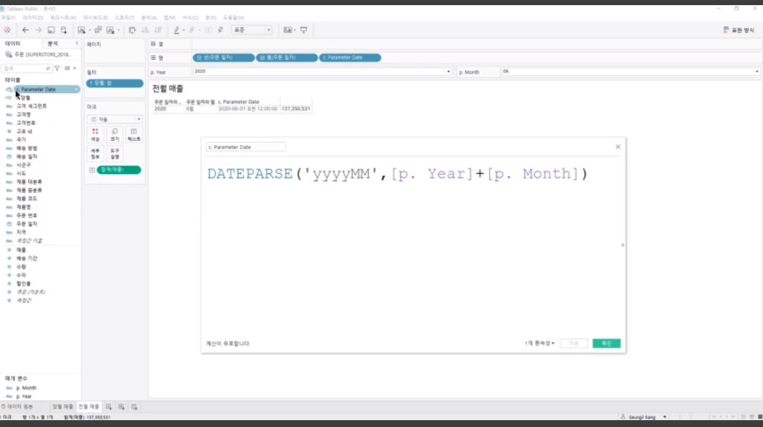 조합한 후 행 선반에 넣는다. 문자열을 날짜로 변경해주는 함수 dateparse를 사용한다.
