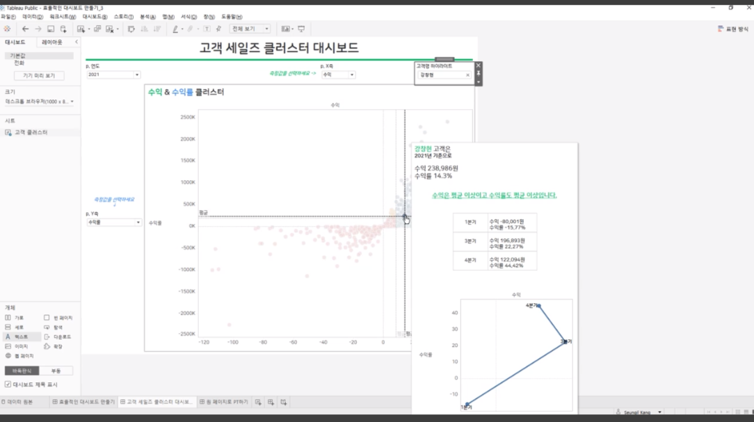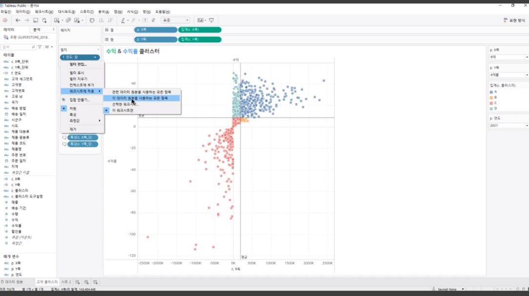 고객 클러스터에 적용된 연도 필터를 도구 설명에 링크된 고객별 분기별 KPI와 연동이 되어야 하므로 '이 데이터원본을 사용하는 모든 항목'을 선택한다. 그러면 고객별 분기별 KPI에도 연도 필터가 적용된다.