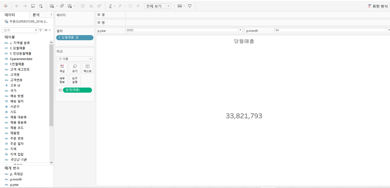 만들어진 c.당월매출 계산식필드를 마크에 있는 합계 필드위에 오버랩한다.