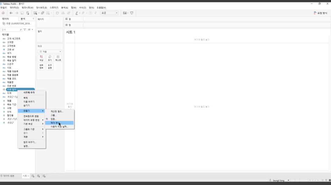 주문일자를 드래그 하여 '세부정보'에 넣는다. 불연속형 분기(주문일자)를 클릭한다.