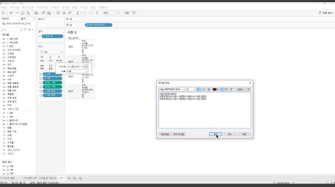 집계2번을 선택하여 도구설명으로 들어와 있는 분기를 레이블로 설정한다.