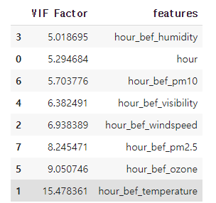 한 시간전 온도가 다중공선성이 있는 걸로 계산 되었습니다. 온도가 타켓변수와 상관성이 높게 나왔기 때문에 무작정 제거 하기 보다는 상관성과 모델링 비교를 통해서 결정해야 할것같습니다.