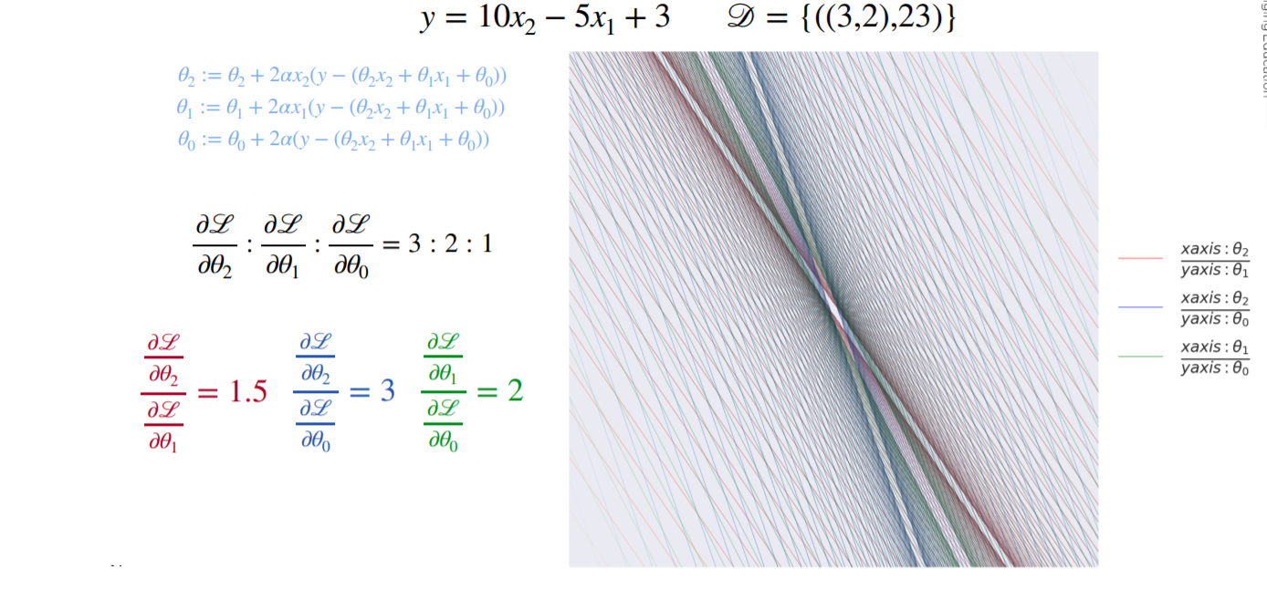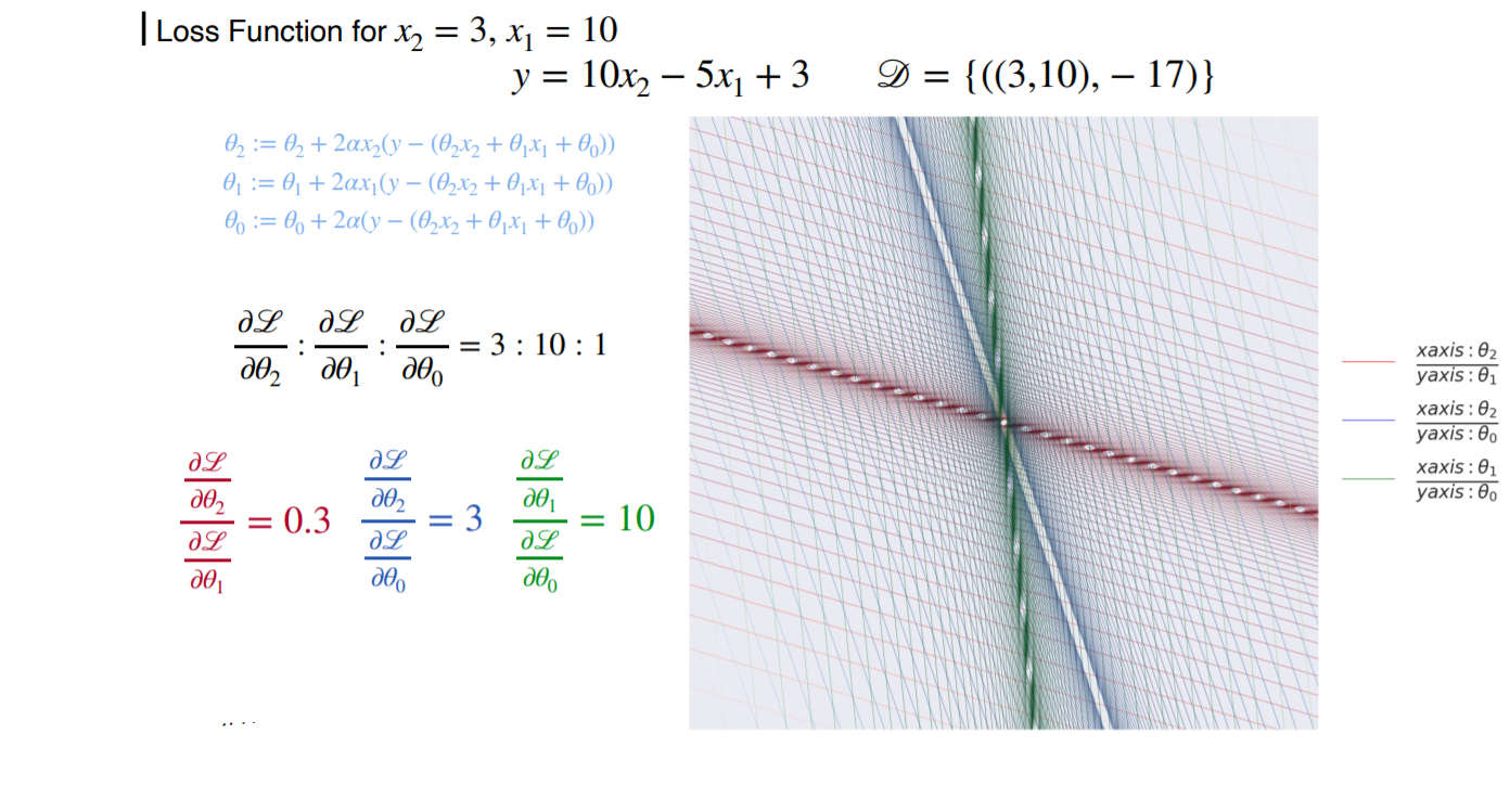두번째 사진에서 적용된 data는 x1의 1뿐이다. 그러면 th2와 th0 간의 비율도 역시 같기 때문에 대각선 방향이며 세번째 그림도 같은 원리로 대각선 방향이다.