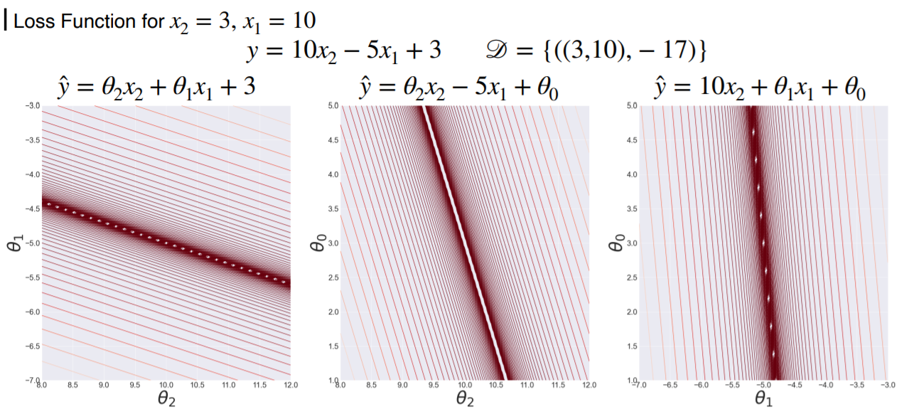 해당 식과 data가 있을때, 변화를 면밀하게 살펴보기 위해서 세개의 값중 하나를 고정시켜 보도록 한다. 가장 왼쪽은 bias가 학습이 다 됐다는 가정 하에 th의 변화를, 두번째는 th1이 학습완료가 됐다는 가정하에 th2와 th0간에 변화를 나타내고 마지막도 같은 원리로 진행한다.
