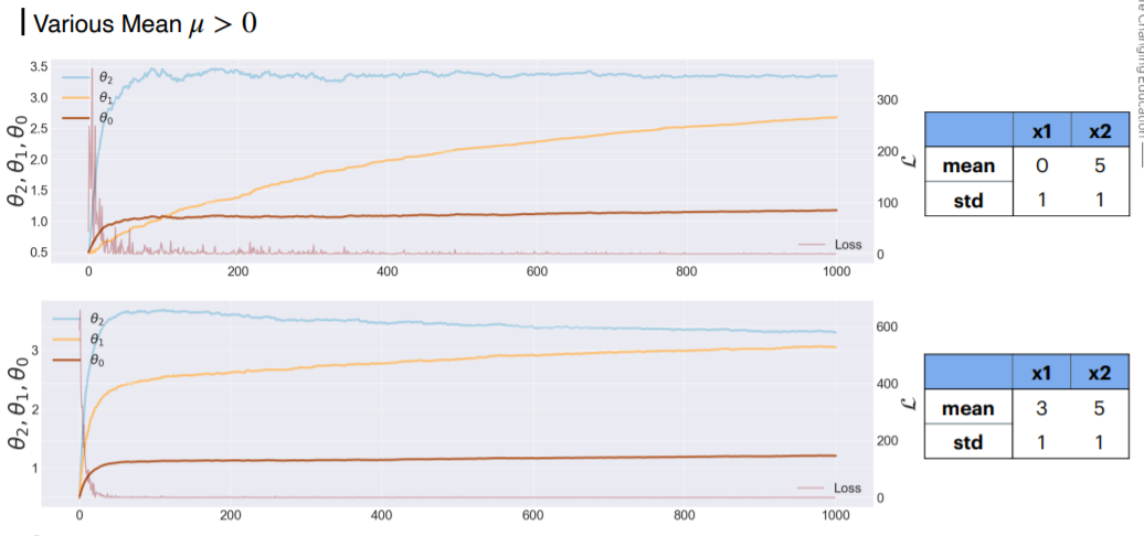 상하단 그림을 비교해 보자. mean값이 커질수록 먼저 학습이 되기 때문에 하단처럼 th2,1이 먼저 치고 올라 가는걸 볼수 있다. 반면 th0은 더욱 느려진다. 왜냐면 Loss가 th2,1에게 많이 뺐겼기 때문이다. 하단의 loss를 보면 평행을 이룰만큼 거의 존재하지 않는다.
