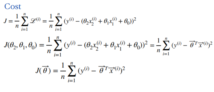 X2가 추가가 되었음을 볼 수 있다. 각 theta, X에 대해서 벡터 형식으로 정리가 가능하다. X 벡터의 1인 dummy 변수를 넣어 줘야 dot product 했을때 계산이 가능합니다.