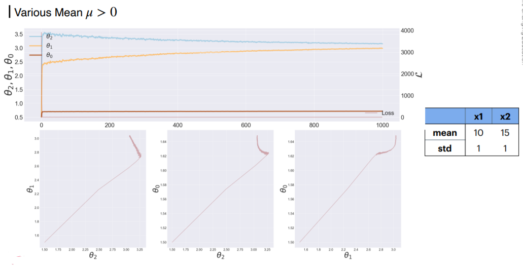 X2의 평균값 자체가 커지면서 th2의 지배적인 학습이 진행됨을 볼수있다. 가운데를 보면 th2가 자기쪽으로 당기기 때문에 th0에 대한 학습이 지그재그로 천천히 학습이 되는 문제점이 생긴다.