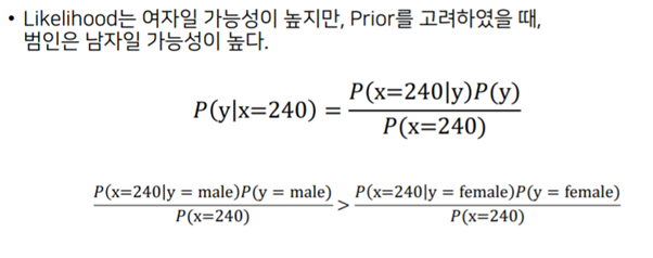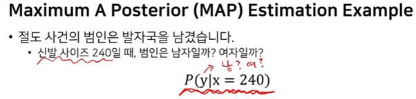 위에서 말한 것처럼, 240신발 사이즈라면 여자일 확률이 높겠지만 P(y=male)의 값이 99%로 압도적이라면 결국 남자가 범인일 확률이 클 수밖에 없다. (P(y=male) = 0.99, P(y=female)=0.01) 이 개념이 MAP이다.