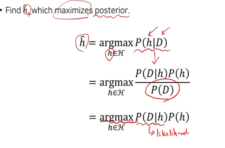 D는 datset를 뜻하고, h는 가정,가설을 뜻한다. 즉, 데이터가 주어 졌을 때 그 데이터에 대한 가설을 얘기하는 것이다. MLE는 likelihood를 maximize하는 방법이다. 마찬가지로 것처럼 h값을 maximize하는 즉, 데이터가 주어 졌을 때 Posterior를 maximize할수있다. 그래서 이번 글에서는 Posterior를 maximize해서 h값을 찾는 방법에 대해서 알아본다.