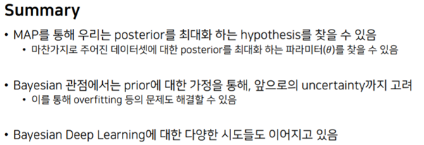 MAP는 likelihood를 최대화 하는 동시에 P(theta)를 최대화 해줘야 한다. 이 말은 즉, theta를 maximize해줘야 한다는 것이다. 이 뜻은 딥러닝 weights 파라미터는 어떠한 확률분포를 가지고 있다는 말이 된다.